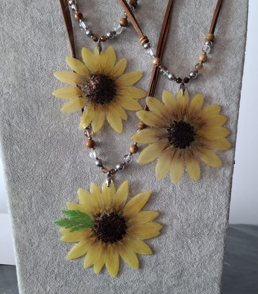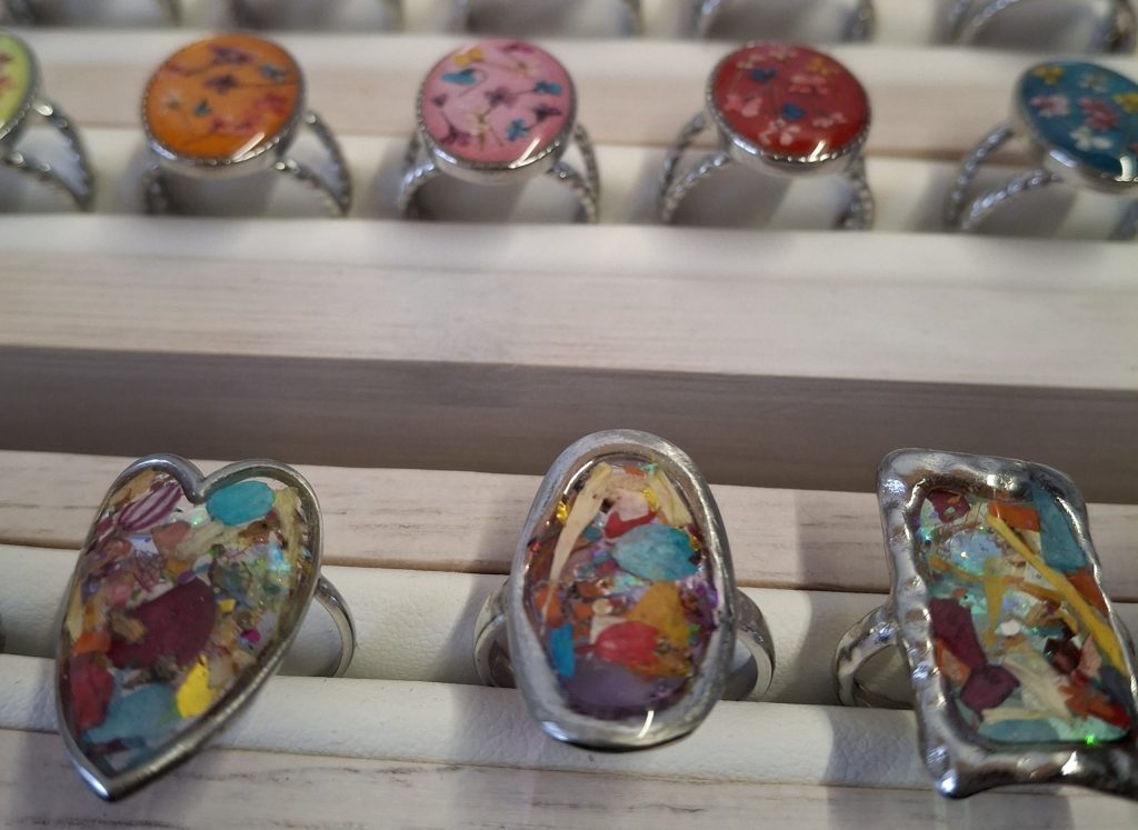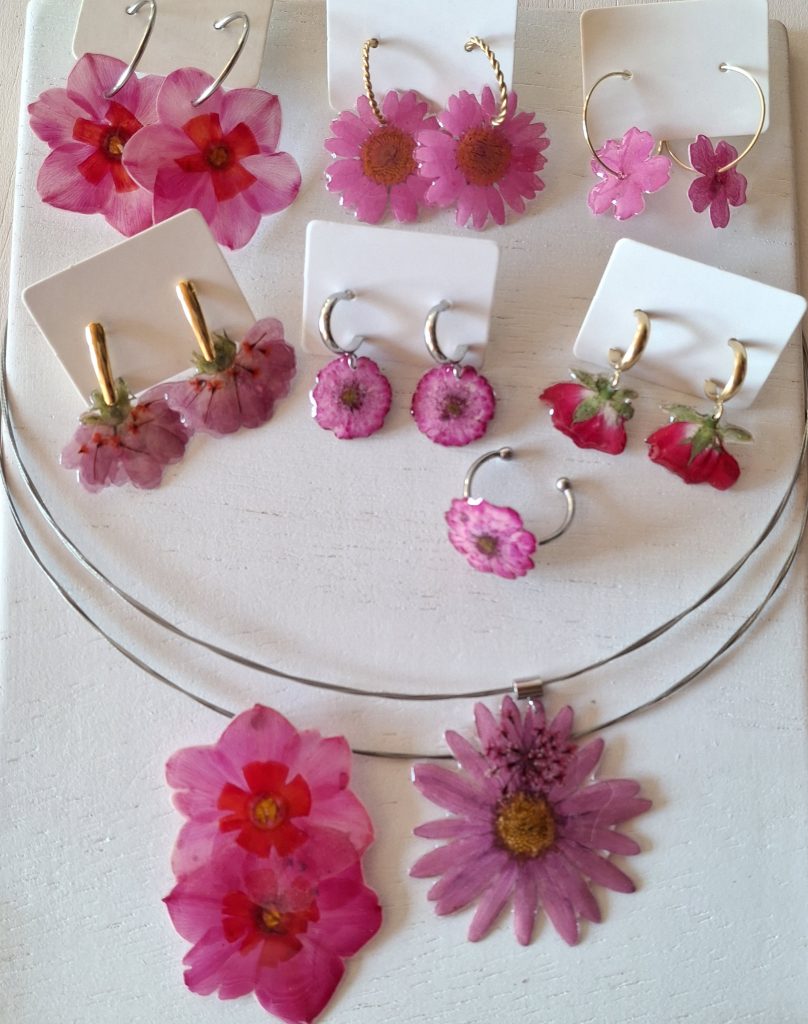 Como artesana bisutera, su universo creativo gira en torno a un elemento muy concreto: la flor. No como simple inspiración, sino como materia viva que se integra en anillos, pendientes y collares. A través de un proceso cuidadoso, estas formas orgánicas pasan a formar parte de piezas únicas, donde lo vegetal y lo artesanal se entrelazan.