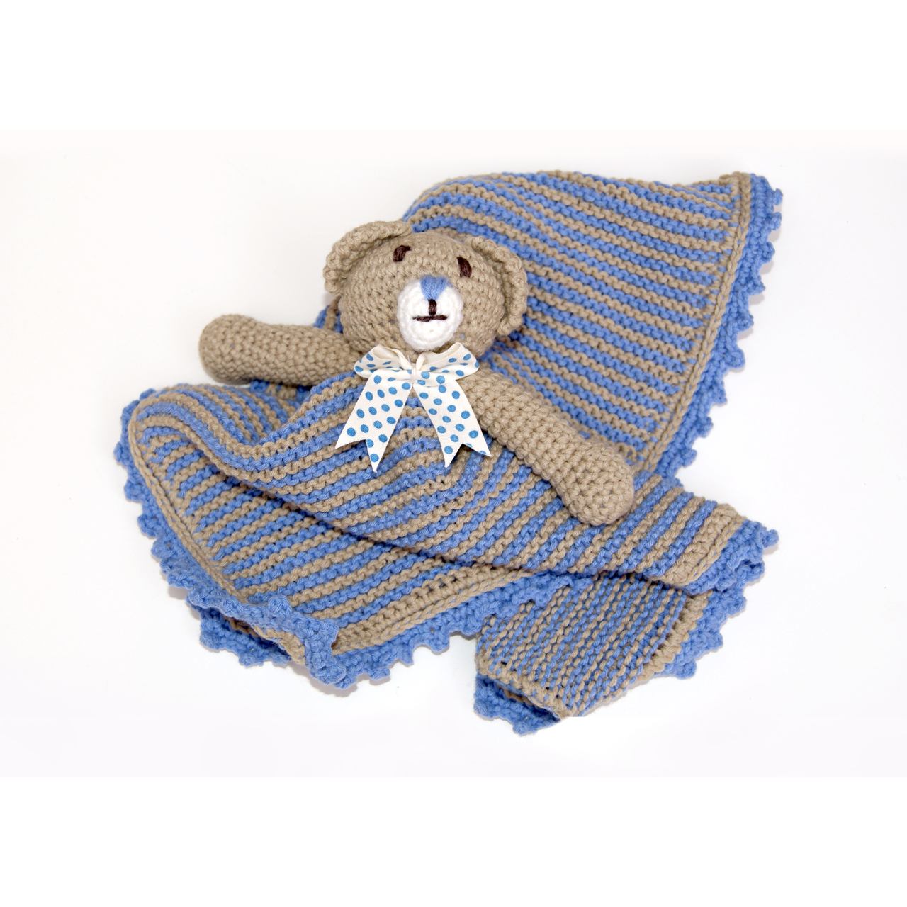 Manta polar de algodon en azul claro, muy suave al tacto, con un acabado en tono beige realizado a crochet, hace que sea un complemento ideal para el abrigo del bebé.